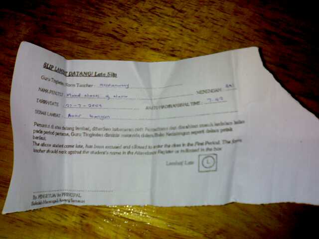 7.40am : datang kulah , and SURPRISE !!kana bagi late slip , baru 1st time dalam se umur hidup ku ne. .hahaha. .so kami membuat tempat kawan kami c fitri kamal and zawawi durg awal dtg wa tp kana tahan dulu coz membaca doa. .membuat tah kami dengan alasan akhir bangun . .oho. .then kata ku pat c yus : "janth dibuat ikut durg c awie saja" then habis dah doa , be check , late slip kami taruh dalam puket. .then ku liat bnyak urg membagi late slip pat cigu. .tapi kami ikut c awie anddd lapas , yahooo! Haha